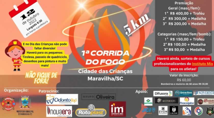 A Associação do Corpo de Bombeiros Comunitário do município de Maravilha realiza no próximo dia 12 de outubro, a 1ª Corrida do Fogo da Cidade das Crianças. Com um percurso de cinco quilômetros, iniciando na rua coberta às 8h30min.