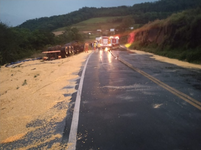 Um acidente de trânsito ocorreu nesta quarta-feira (19), por volta das 17h10, na altura do Km 23,7 da rodovia SC 160, no município de Saltinho/SC. De acordo com a Polícia Militar Rodoviária Estadual (PMRv), no local foi registrado um capotamento de um caminhão carreta, com placas do Paraguai, que era conduzido por um homem de 31 anos, que teve ferimentos de natureza leve. No caminhão foram constatados danos de grande monta.A carga de milho ficou esparramada na lateral da rodovia. A carga de milho ficou esparramada na lateral da rodovia.