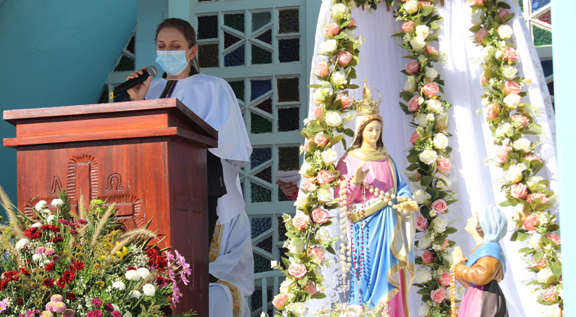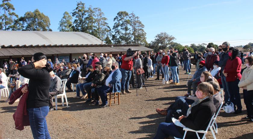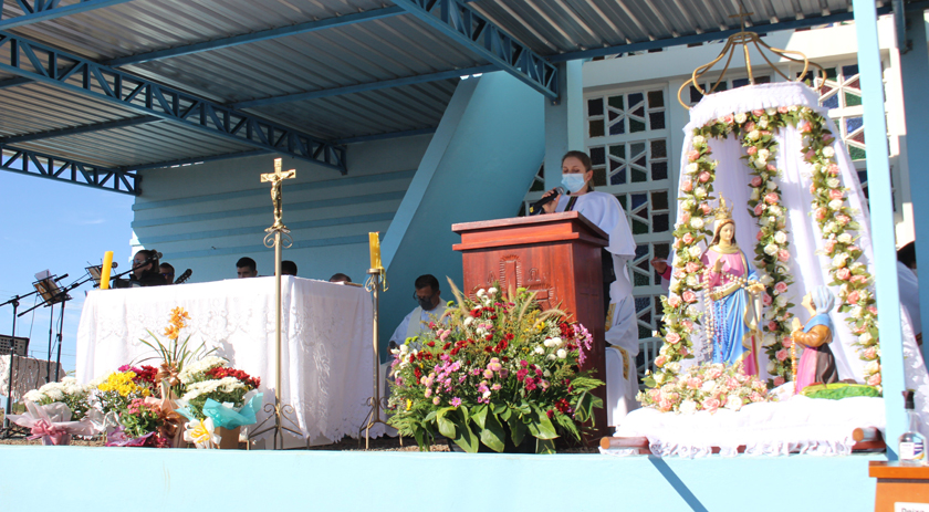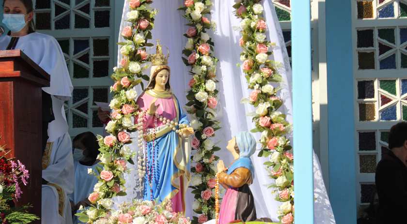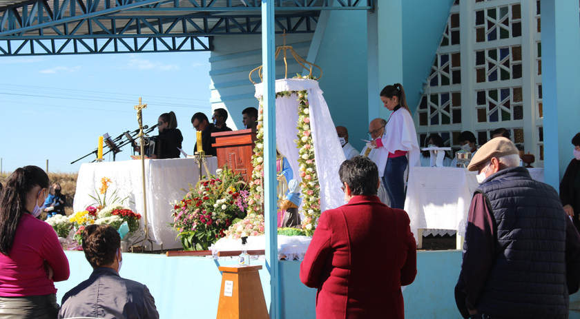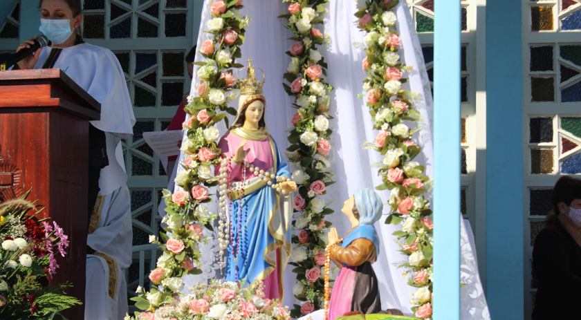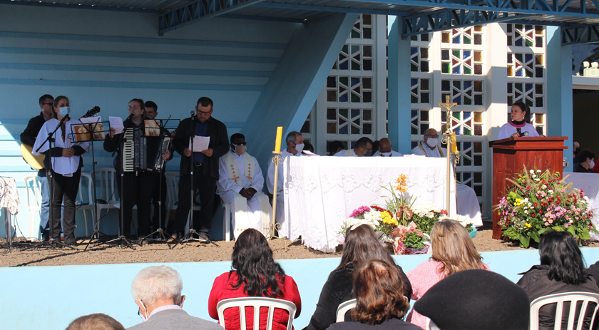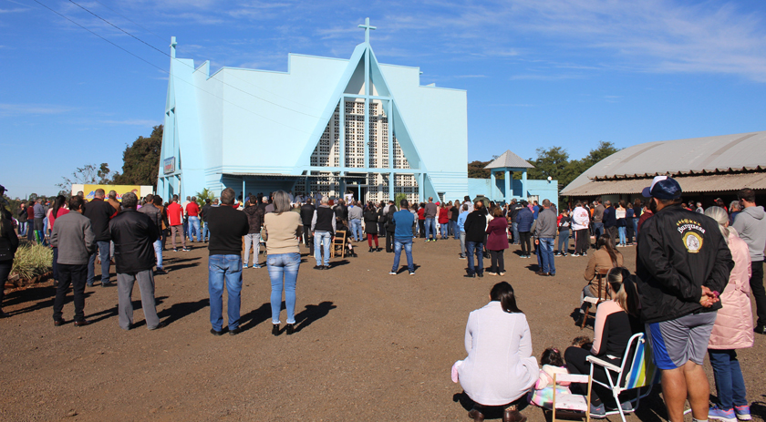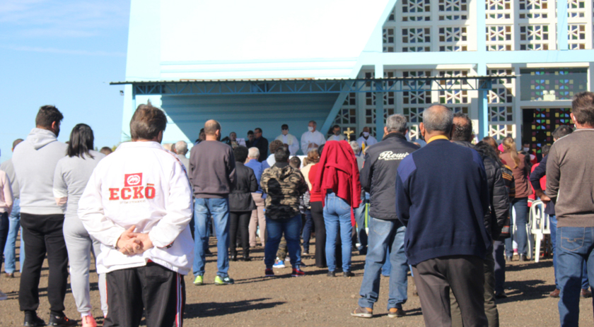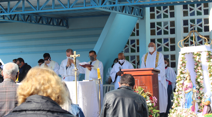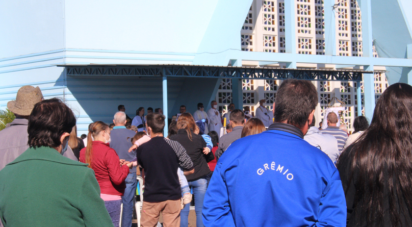 As missas são realizadas ao ar livre, sendo que os cuidados de proteção contra o coronavírus estão sendo tomados com a obrigatoriedade do uso de máscara e o distanciamento entre o público.