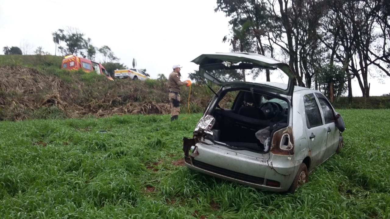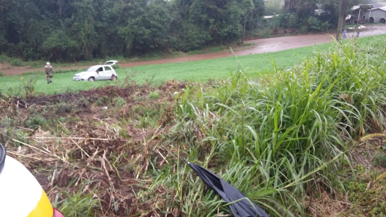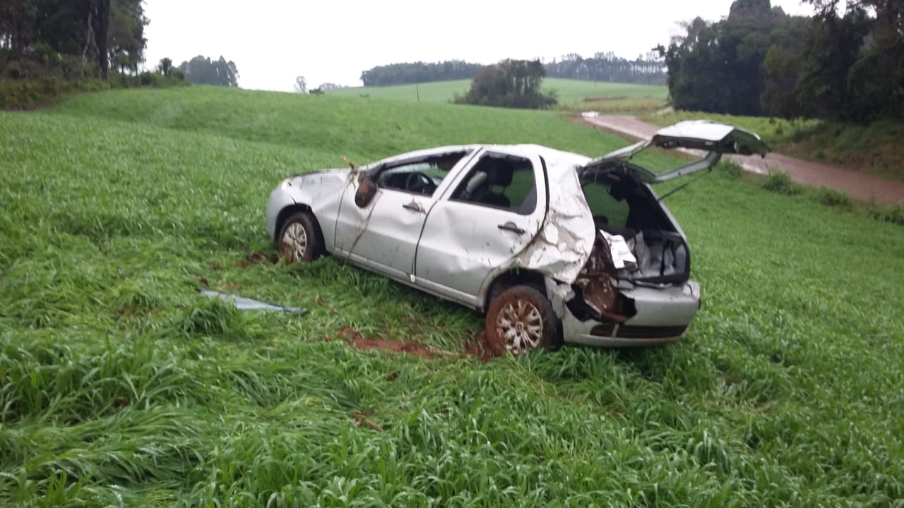 Ao chegar no local o Corpo de Bombeiros constatou o capotamento, envolvendo o automóvel Fiat/Pálio emplacado no município de Mondaí.