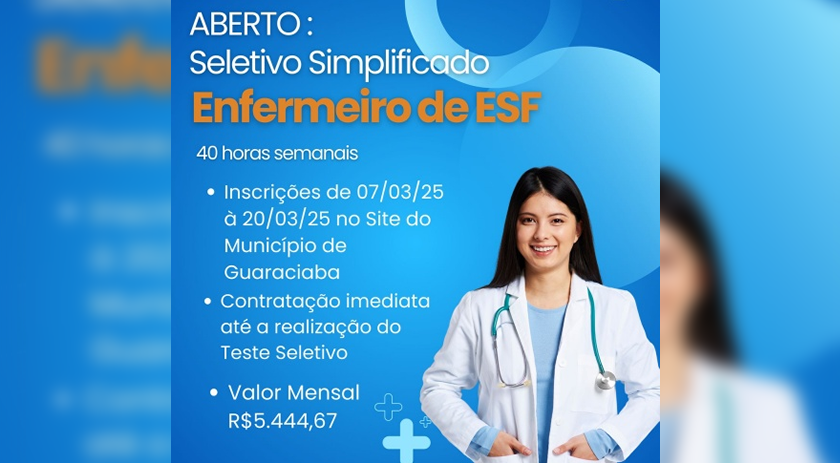 A Administração Municipal de Guaraciaba abriu o Processo Seletivo Simplificado 20/2025 para o Cargo de Enfermeiro de ESF, com carga horária de 40 horas semanais. Os requisitos para a vaga é possuir ensino superior em Enfermagem com registro no Órgão fiscalizador da categoria profissional, e o valor mensal do salário é R$ 5.444,67.