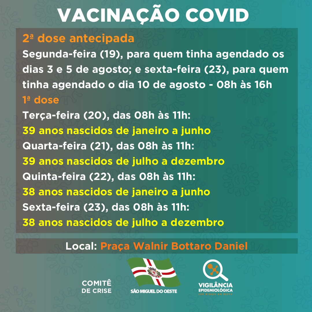 Na quinta (22), receberão a primeira dose da vacina, das 08h às 11h, as pessoas com 38 anos de idade nascidas entre os meses de janeiro e junho e, na sexta (23), neste mesmo horário, as pessoas com 38 anos nascidas entre julho e dezembro.