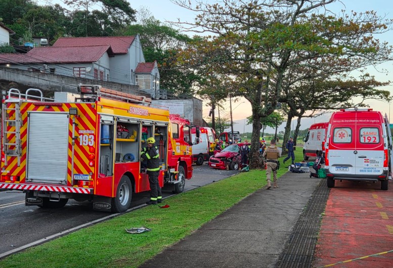 De acordo com o Corpo de Bombeiros Militar de Santa Catarina, o impacto foi frontal. No carro estavam quatro ocupantes — três homens e uma mulher. Um dos homens já estava sem vida quando as equipes chegaram ao local. O segundo homem, que estava preso às ferragens, foi encontrado em parada cardiorrespiratória e, mesmo após tentativas de reanimação, não resistiu.