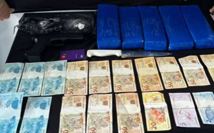 Com o auxílio do cão farejador Aila, a equipe localizou no forro da residência cinco tabletes de maconha, que totalizaram pouco mais de 3,6 quilos, além de um simulacro de pistola. No imóvel também foram apreendidos dinheiro em espécie, um telefone celular e materiais utilizados para embalar drogas.
