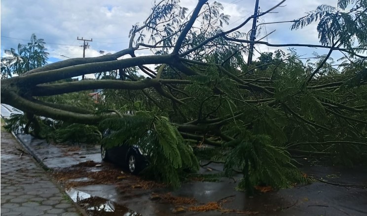 O Corpo de Bombeiros foi acionado às 12h15 para atender uma ocorrência de averiguação de queda de árvore. No local, as equipes confirmaram que se tratava de uma árvore de grande porte, composta por três ramificações principais. Uma delas se rompeu e caiu sobre um veículo Ford Focus que estava estacionado em via pública.