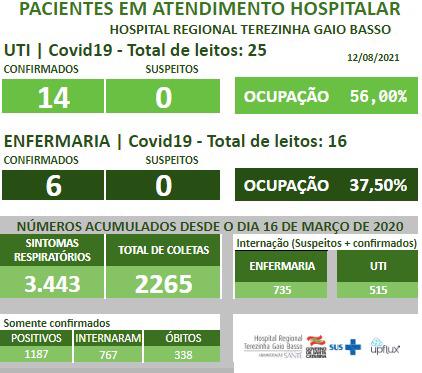 Também foram registradas 2 altas hospitalares: pacientes de Dionísio Cerqueira e São João do Oeste. Além de 2 altas de pacientes que estavam na UTI para a enfermaria. A ocupação de hoje é de 14 pacientes confirmados na UTI. Na enfermaria são 6 confirmados.