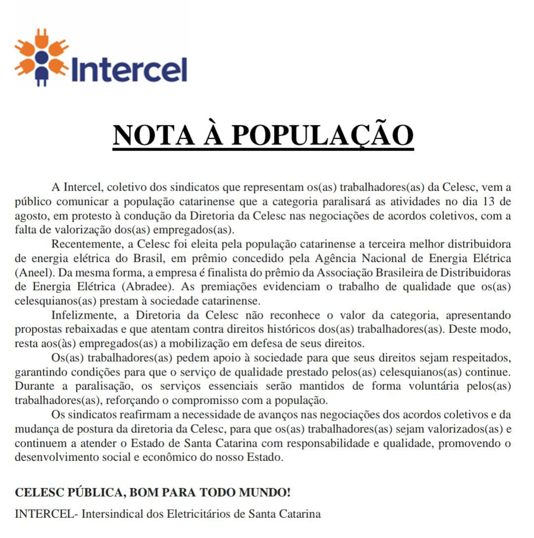 A Intercel, coletivo dos sindicatos que representam os(as) trabalhadores(as) da Celesc, comunica a população catarinense que a categoria paralisará as atividades no dia 13 de agosto, em protesto à condução da Diretoria da Celesc nas negociações de acordos coletivos, com a falta de valorização dos(as) empregados(as).