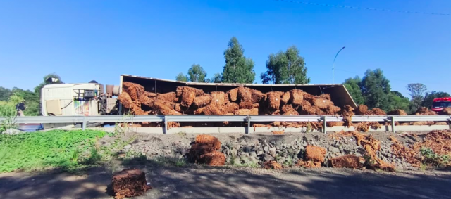 Carreta carregada de fumo tomba na BR-158 e interdita rodovia