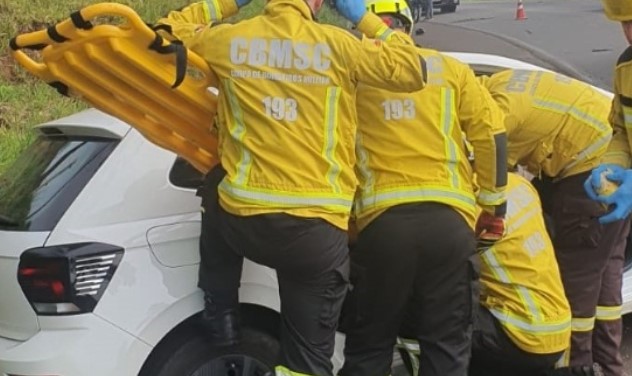 Grave acidente entre carros deixa motorista preso nas ferragens na BR-282