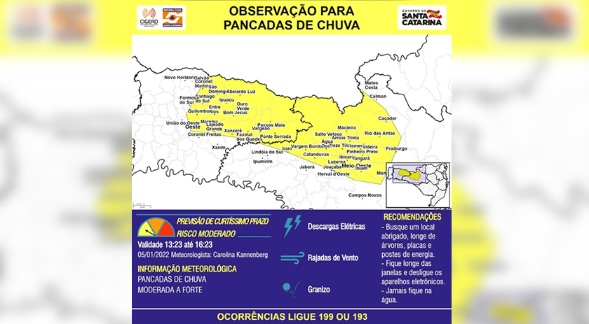 A Defesa Civil de Santa Catarina emitiu um alerta para a possibilidade de pancadas de chuva, de intensidade moderada a forte, com descargas elétricas, rajadas de vento e granizo. O aviso é válido para esta quarta-feira (05) para a região Oeste e Meio Oeste de Santa Catarina.