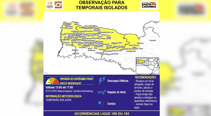 “OBSERVAÇÃO – 07/01 15:09 – TEMPORAIS ISOLADOS, com DESCARGAS ELÉTRICAS, RAJADAS DE VENTO e GRANIZO, para as regiões do Extremo Oeste, Oeste e Meio-Oeste nas próximas 2 horas. Ocorrências ligue 199 ou 193”, informou a Defesa Civil.