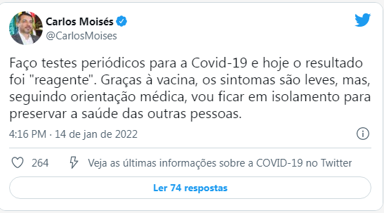 Através de uma postagem no Twitter, o governador de Santa Catarina, Carlos Moisés informou nesta sexta-feira (14), que testou positivo para a Covid-19, pela segunda vez. A primeira vez que o político foi infectado pelo vírus foi em julho de 2020. Conforme Moisés, "graças à vacina, os sintomas são leves".