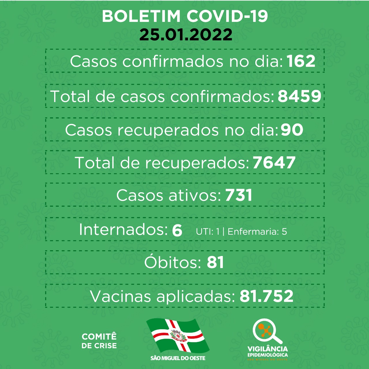 No total, 8459 pessoas foram confirmadas com a doença no município, das quais 7647 já se recuperaram e 731 estão com o vírus ativo.