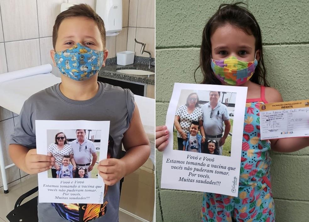 A outra neta, Ana Laura Pires da Costa Araújo, de 5 anos, também levou a foto dos avós para tomar vacina em São Paulo.