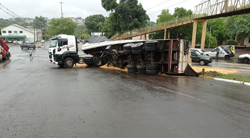 Na tarde desta sexta-feira (28/01), a carga de um caminhão carregado de milho caiu em cima de um carro, em Marmeleiro.