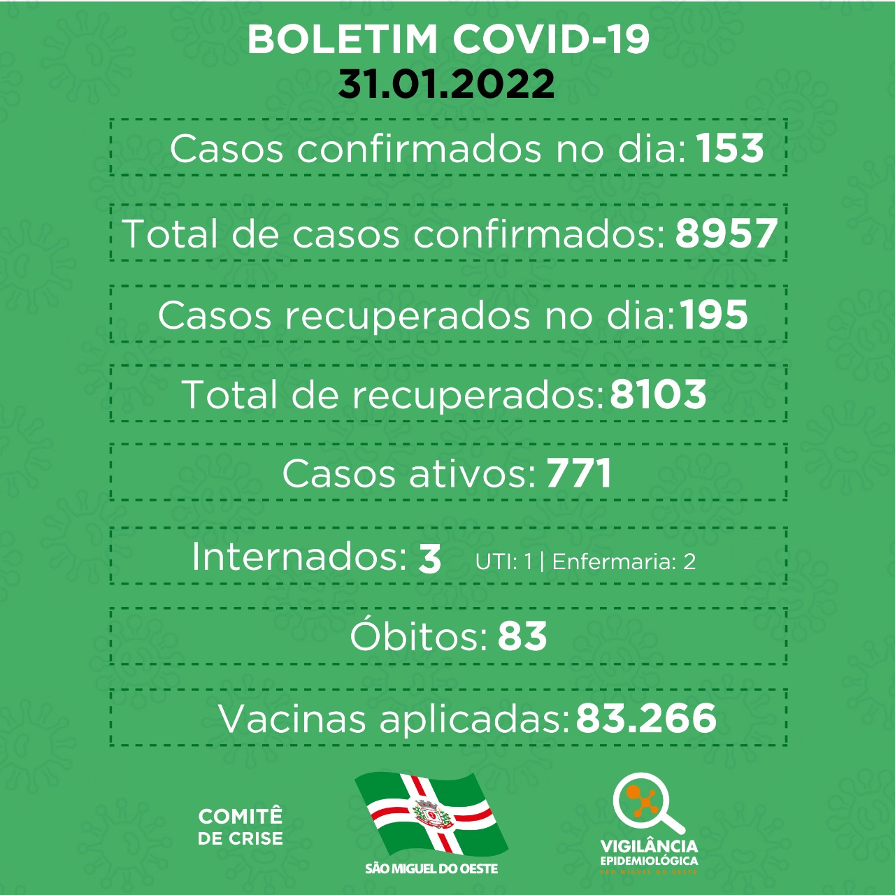 No total, 8957 pessoas foram confirmadas com a doença no município, das quais 8103 já se recuperaram e 771 estão com o vírus ativo.