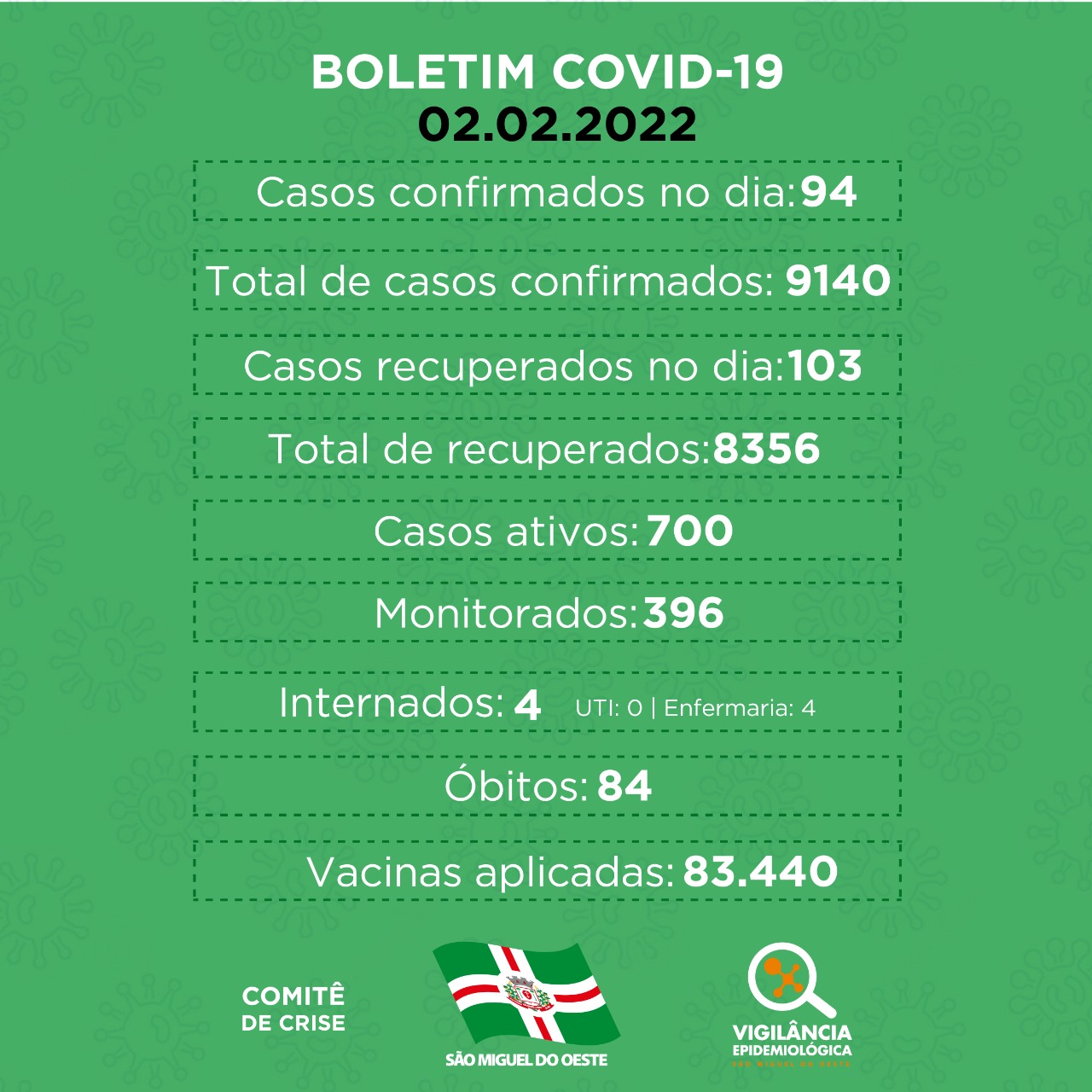 No total, 9140 pessoas foram confirmadas com a doença no município, das quais 8356 já se recuperaram e 700 estão com o vírus ativo.