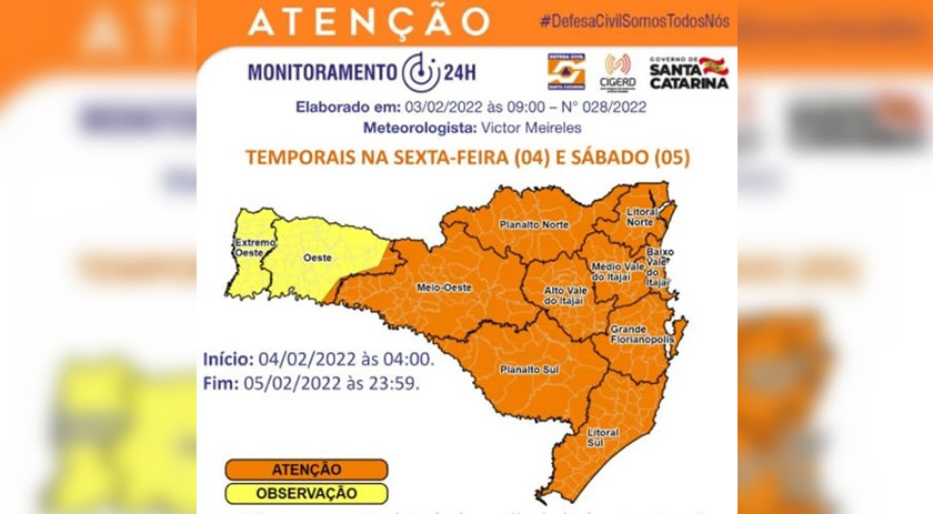 Dessa forma, a expectativa é que os temporais se iniciem já na madrugada de sexta pelo Oeste de Santa Catarina e se desloque para as demais regiões entre a tarde e a parte da noite. O mesmo cenário deve se repetir ao longo do sábado.