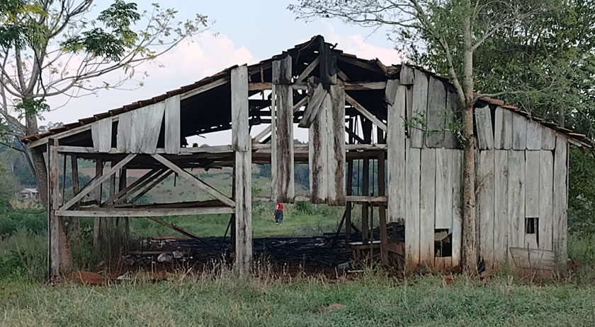 O Corpo de Bombeiros foi acionado para atender a ocorrência, chegando no local o fogo estava consumind9o o galpão, ele estava construído em meio a lavoura.
