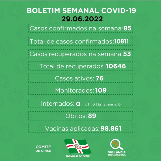 A Secretaria de Saúde de São Miguel do oeste informou nesta quarta-feira (29) , que oitenta e cinco (85) pessoas foram diagnosticadas com covid-19 nos últimos sete dias no municíoui.