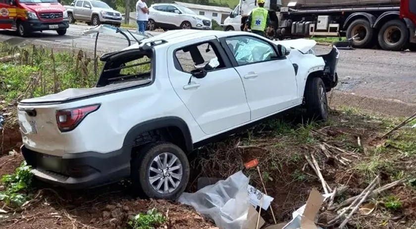 Segundo o Corpo de Bombeiros Militar, a caminhonete e o caminhão bateram de frente e após a colisão a Fiat/Toro saiu da pista e caiu em uma vala às margens da rodovia.