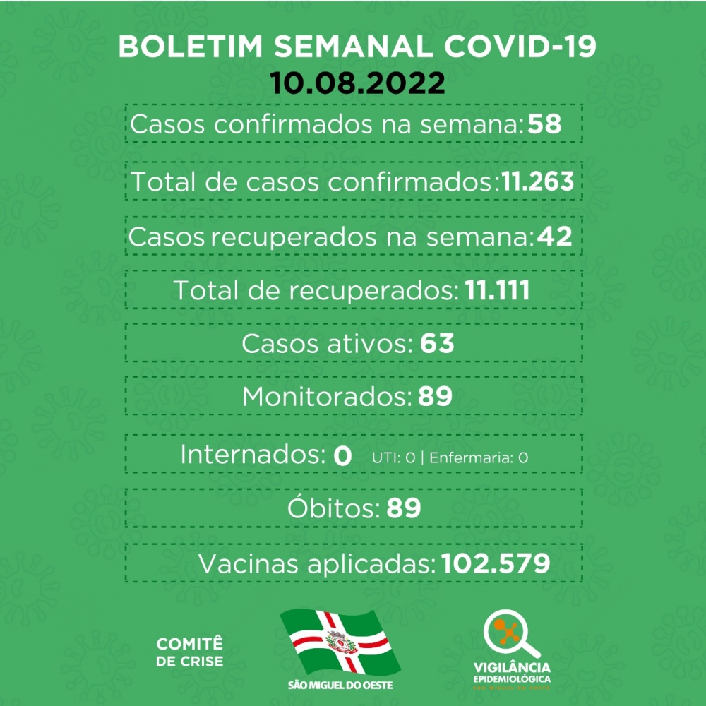 Nos últimos sete dias, 58 pessoas positivaram para Covid-19 em São Miguel do Oeste. De acordo com a Secretaria de Saúde, 42 pessoas entraram para a lista de recuperados neste mesmo período.
