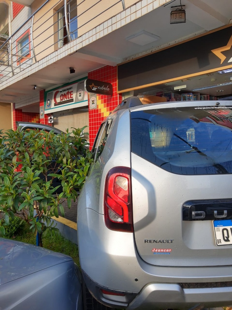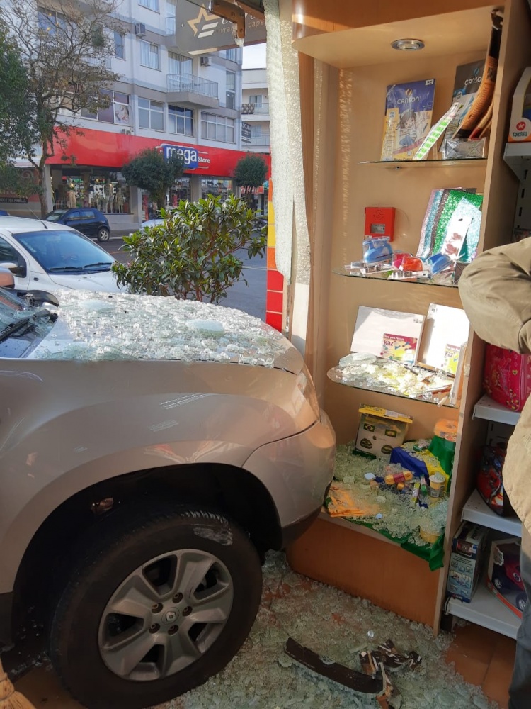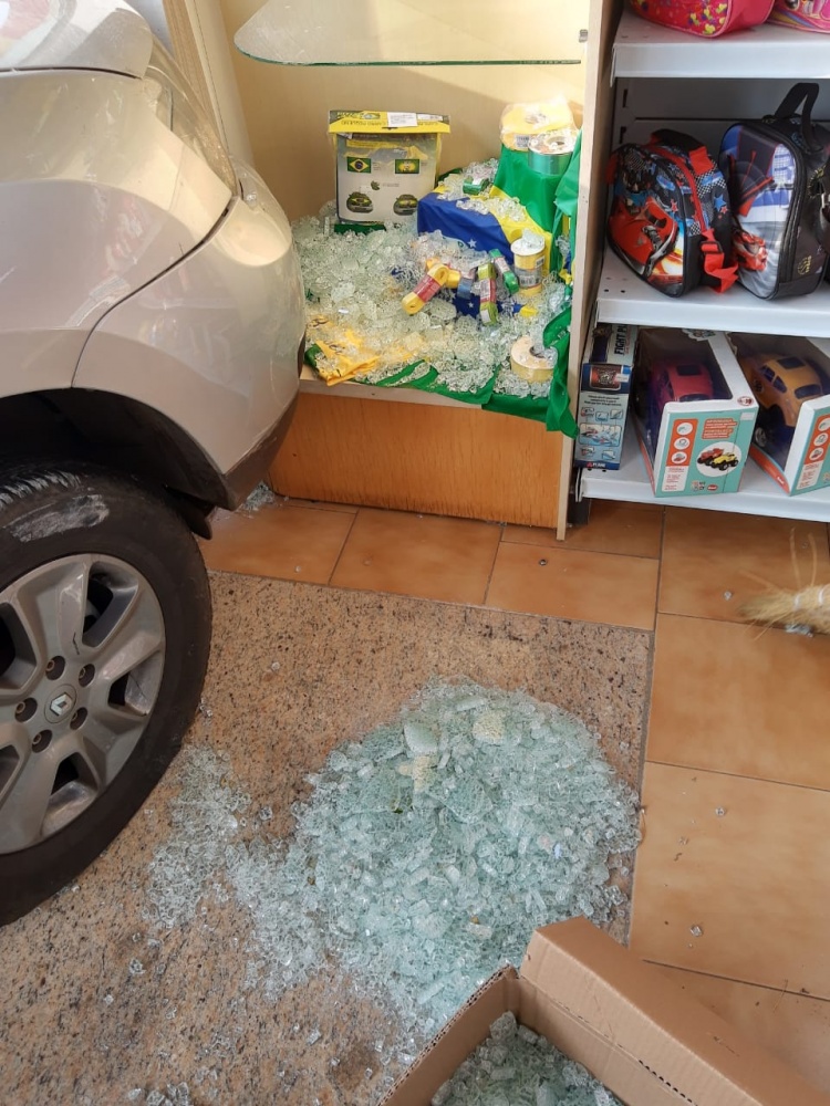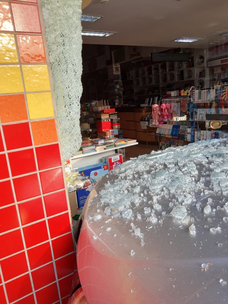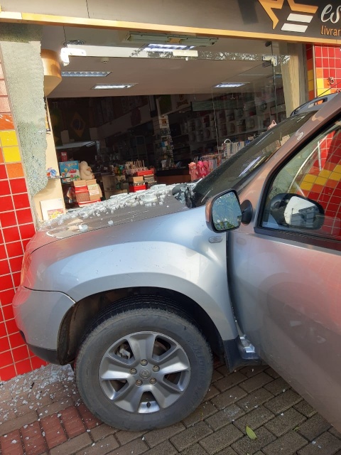 Um veículo Renault Duster acabou invadindo a calçada e colidindo na vitrine de uma livraria, quebrando o vidro na entrada do estabelecimento. A condutora ão sofreu ferimentos.