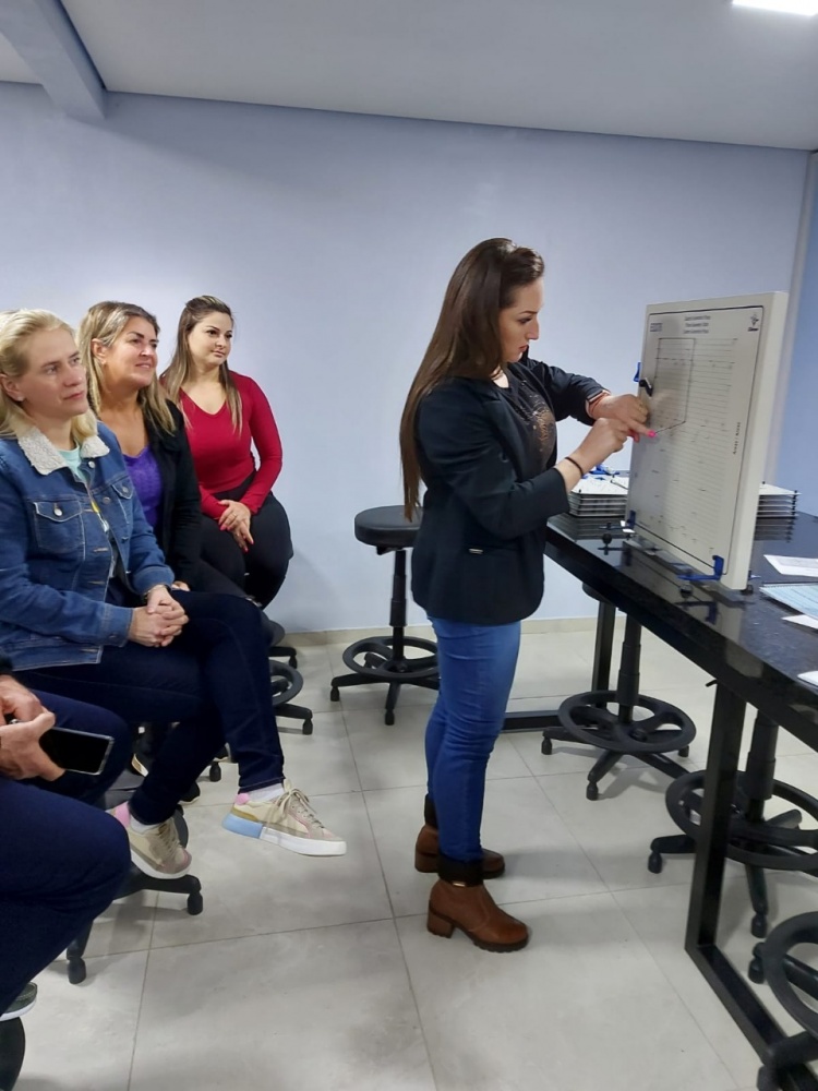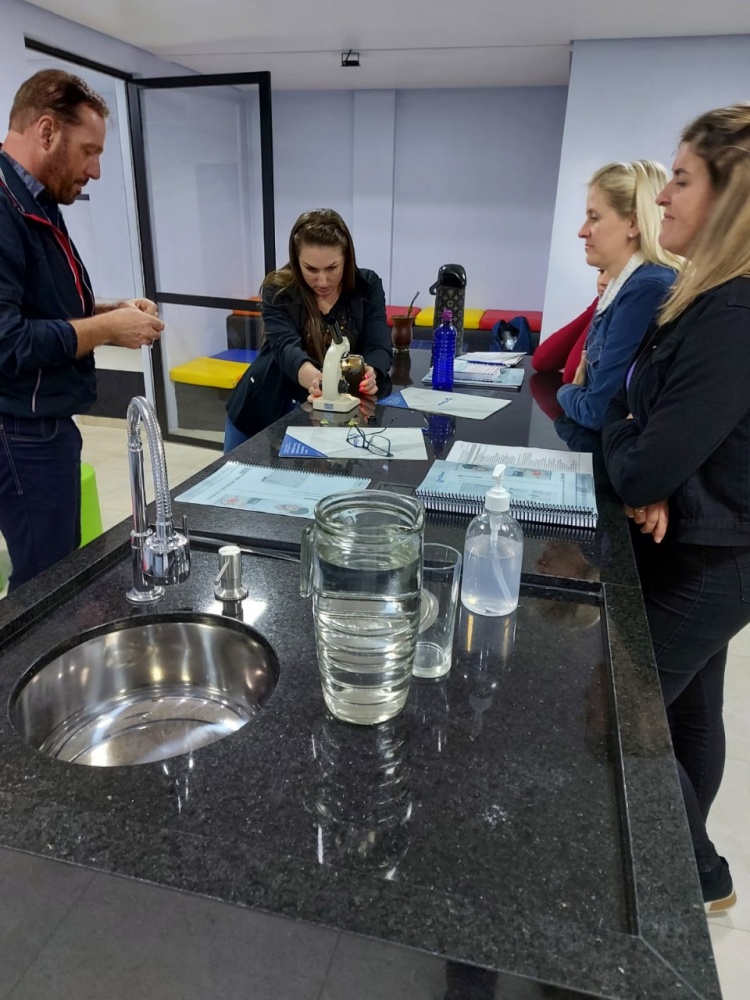 A professora, Carmen Buffon, do Cidepe, Centro Industrial de Equipamentos de Ensino e Pesquisa, esteve na quinta-feira (8), ministrando curso aos professores no laboratório de Ciências da Escola Padre Alfredo Kasper.