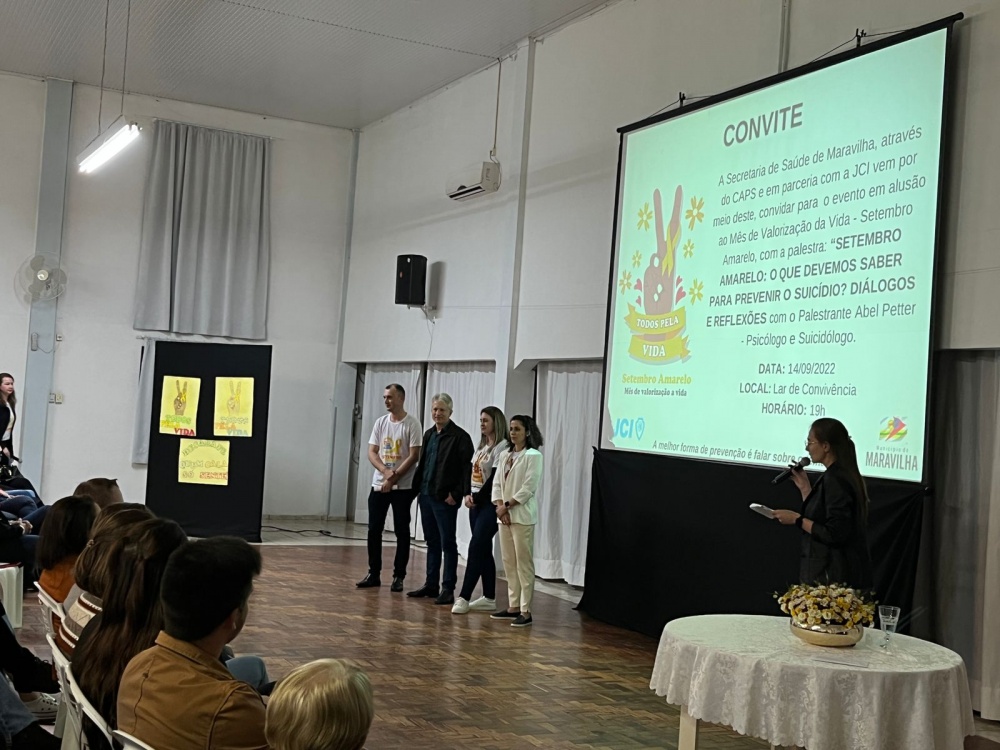 A secretaria de Saúde de Maravilha, por meio do Caps, em parceria com a JCI, realizou uma grande palestra na noite desta quarta-feira (14) na sede do grupo de idosos Lar de Convivência, em Maravilha. A palestra foi com o psicólogo e suicidólogo Abel Petter, de São Miguel do Oeste. Ele abordou prevenção ao suicídio. O tema foi “Setembro amarelo: O que devemos saber para prevenir o suicídio? Diálogos e reflexões”.