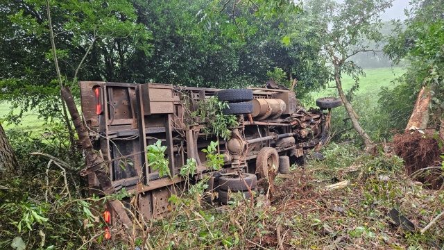 O condutor sofreu ferimentos na cabeça em decorrência da queda. O caminhão saiu de pista, colidiu contra uma árvore e tombou ao lado da rodovia.