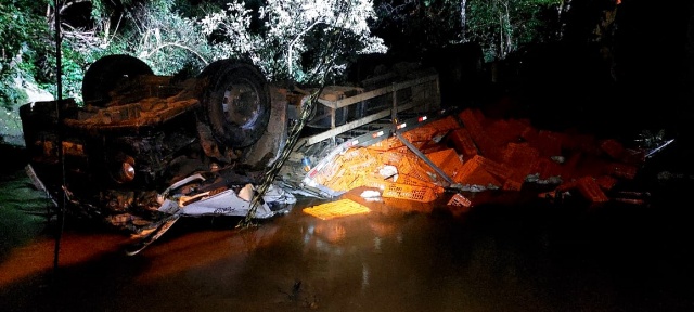 Um acidente grave na madrugada desta quinta-feira (22), por volta das 2h10, resultou em três vítimas fatais na rodovia SC-480, próximo à rodoviária, no município de São Domingos. O Corpo de Bombeiros Militar de São Domingos atendeu a ocorrência, que envolveu a saída de pista seguida de capotamento de um caminhão que acabou tombando dentro de um riacho.
