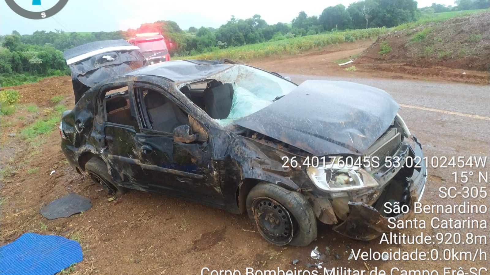 Segundo o Corpo de Bombeiros, um GM Prisma, com placas do Mercosul, saiu da pista e capotou na SC 305. O carro era ocupado por um casal e por três menores de idade, de 7, 9 e 15 anos.
