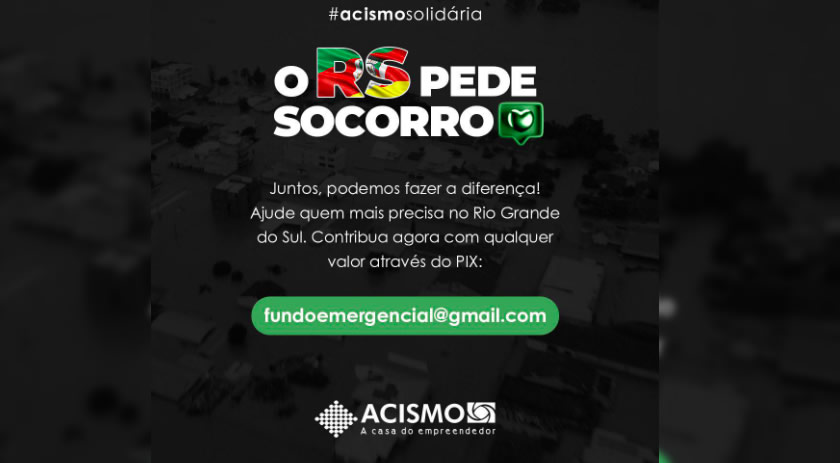 Com a situação crítica enfrentada pelo Rio Grande do Sul, a Acismo convoca os empresários e a população local a se unirem em solidariedade para ajudar aqueles que foram afetados pelas enchentes. A campanha consiste na arrecadação de fundos via PIX, que serão integralmente destinados para auxiliar os atingidos.