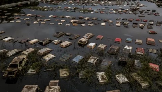 No último sábado (25), o fotógrafo Rafa Neddermeyer da Agência Brasil flagrou um grande ‘cemitérios de carros’, próximo ao posto da Polícia Rodoviária Federal (PRF) e ao Aeroporto Salgado Filho, na zona norte de Porto Alegre, na capital do Rio Grande do Sul. Nas imagens é possível ver diversos carros submersos e destruídos, devido às enchentes no Estado gaúcho. O local era utilizado por uma empresa de locação de veículos.