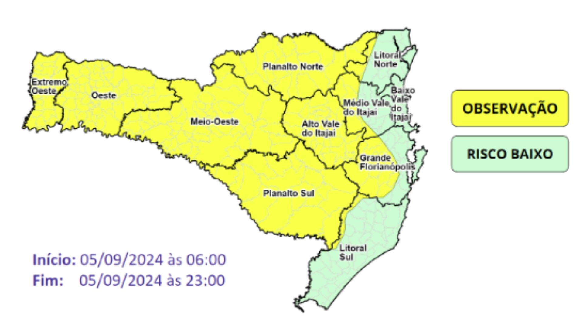 Já nas áreas em verde, o declínio deve variar de 7°C a 10°C, com risco baixo para ocorrências.