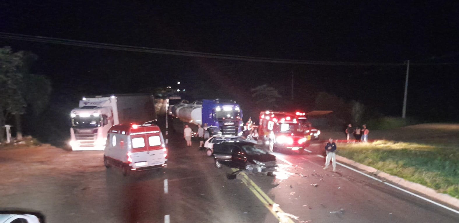 Uma colisão envolvendo três veículos de passeio deixou pelo menos duas pessoas feridas na madrugada deste sábado, dia 22, na BR-282, em Xaxim, no Oeste catarinense.