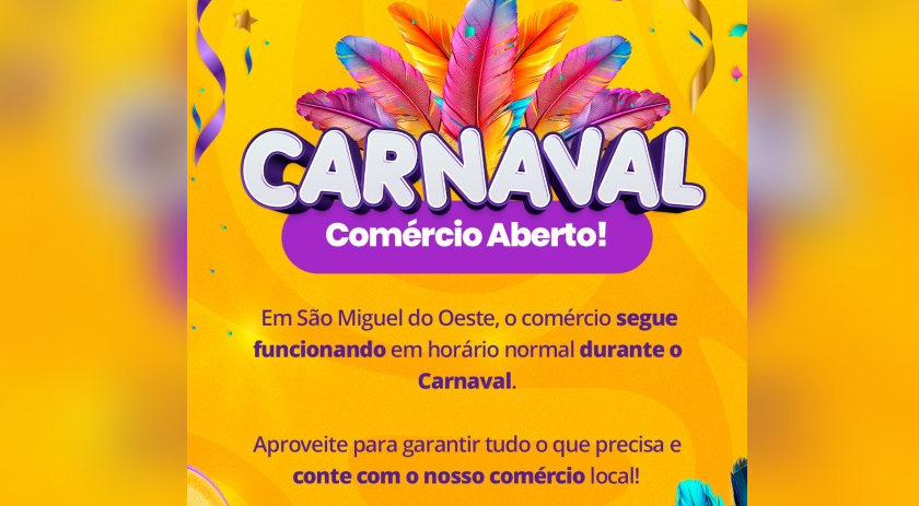 A entidade reforça que o Carnaval não é considerado feriado nacional, sendo classificado apenas como ponto facultativo. No município, não há celebrações oficiais da data, e a Prefeitura de São Miguel do Oeste manterá expediente normal, sem decretar ponto facultativo. Da mesma forma, as escolas e creches da rede municipal funcionarão regularmente.