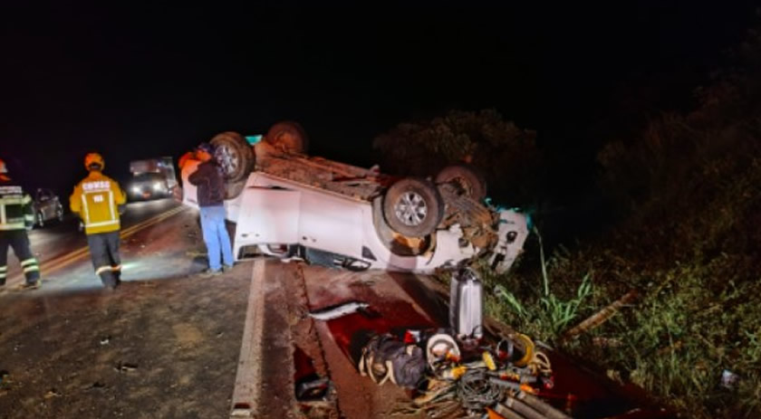 Segundo os bombeiros, o condutor tentava concluir uma ultrapassagem quando retornou para a pista e colidiu com a carreta que seguia no mesmo sentido, perdendo o controle do veículo e capotando.
