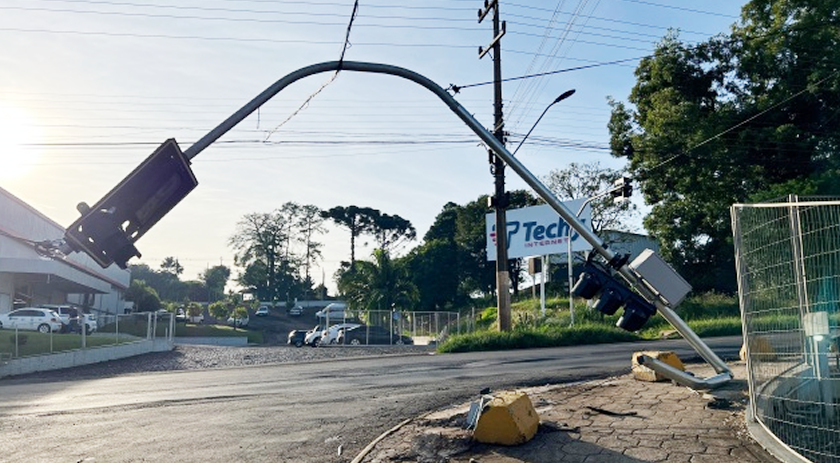 De acordo com informações apuradas no local, o caminhão trafegava pela rua Arnô Éric Schwanback e, ao fazer a conversão em direção ao trevo da cidade, colidiu com o semáforo. O impacto fez com que o equipamento ficasse pendurado apenas pelos cabos, gerando risco iminente a pedestres e motoristas que circulavam pela via.