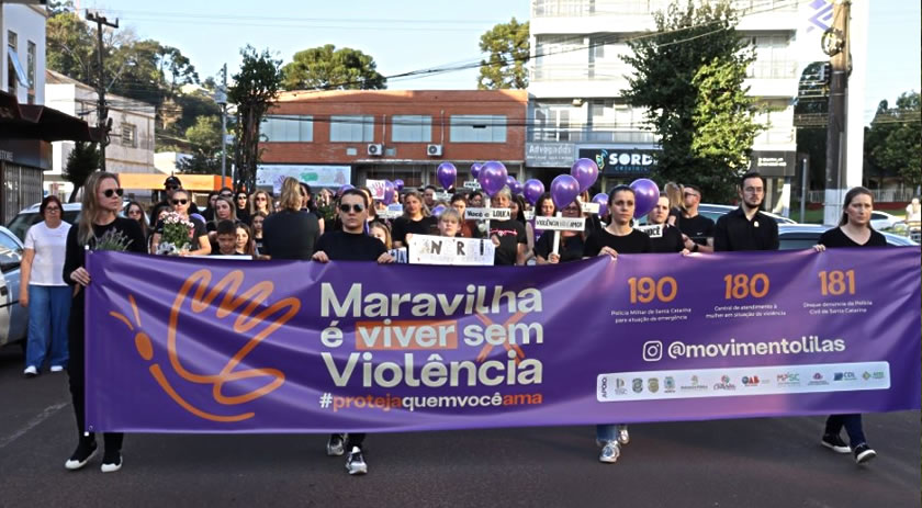 A mobilização teve início às 17h, com uma caminhada silenciosa que percorreu a Avenida Sul Brasil até a Praça da Matriz. Vestidos de preto em sinal de luto e respeito, os participantes carregavam flores, cartazes, balões lilás, faixas e cruzes com frases de impacto, reforçando a mensagem de enfrentamento a violência doméstica e familiar.
