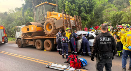 A batida foi entre um automóvel e um caminhão. Com o impacto, o carro pequeno entrou parcialmente embaixo da parte traseira do veículo de carga, que transportava um trator em uma plataforma.