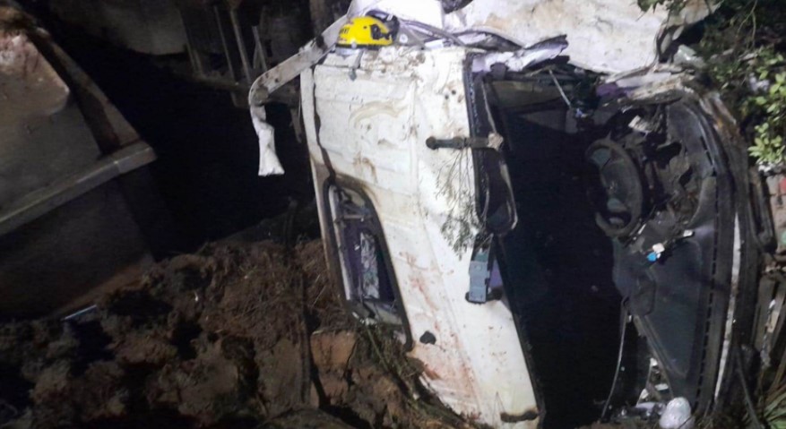 Carregado com miúdos de suíno, o caminhão saiu da pista e despencou em um barranco por volta das 4 horas da manhã, em um trecho na altura da comunidade de Paiol dos Belos.