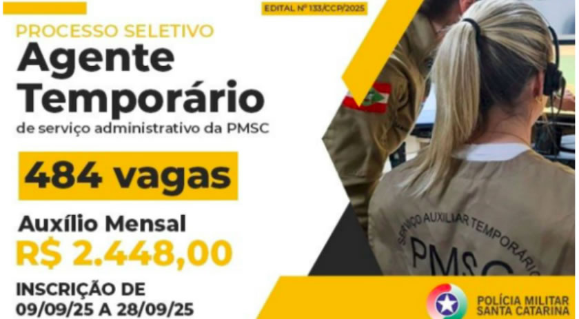 A Polícia Militar de Santa Catarina abriu na terça-feira (9) edital para a contratação de 484 agentes temporários para atuar na corporação. As inscrições devem ser feitas exclusivamente pela internet até o dia 28 de setembro.