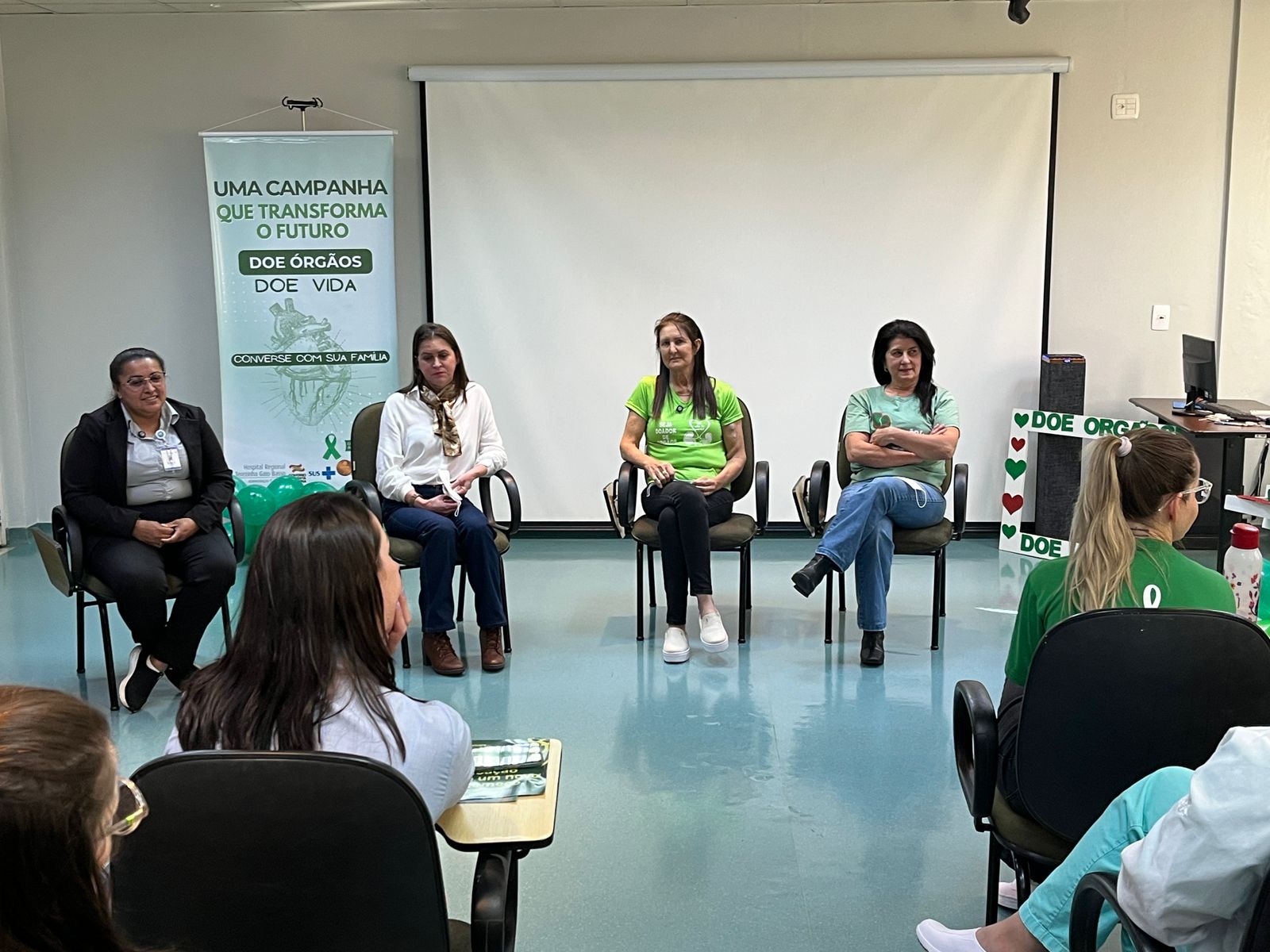 Participaram como convidadas da ação Salete Klein Borges, que passou duas vezes por transplante renal, sendo o último em julho de 2025; Ivanir Milani, transplantada renal em agosto de 2024; Sandra Loro, transplantada de pulmão em dezembro de 2024;, e a colaboradora do HRTGB-Santé, Meirilane Nascimento de Oliveira, transplantada de córnea há 24 anos.