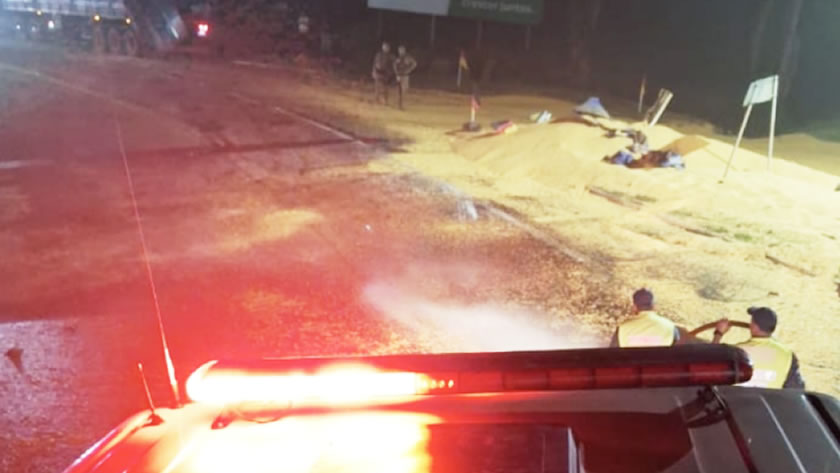 Na madrugada desta segunda-feira (29), uma carreta com placas do Paraguai, carregada de milho, tombou na SC-163, em Linha Chácara, Itapiranga, e interditou parte da rodovia. O acidente aconteceu por volta das 3h20.
