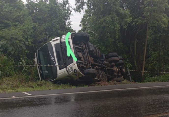 O caminhão seguia no sentido Quilombo a Coronel Freitas quando o condutor, um homem de 34 anos, perdeu o controle da direção, resultando na saída de pista e no tombamento.