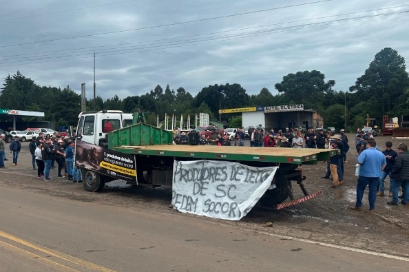 Eles discursaram sobre o cenário atual e estenderam faixas em direção à rodovia, com frases como “produtores de leite de SC pedem socorro” e “o produtor de leite não aguenta mais, pare com a importação já!”