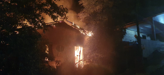 Casa de alvenaria de 42m², no Bairro Frigorifico, ficou totalmente tomada pelo fogo na noite desta quarta-feira (12). Guarnições de São Carlos e Palmitos atuaram para extinguir as chamas e proteger imóvel vizinho.