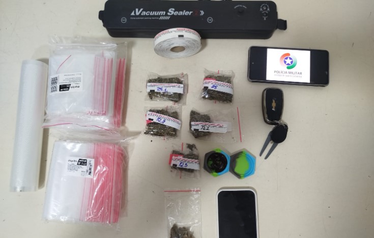 Além da droga, a polícia encontrou rolos de fita, envelopes e uma máquina seladora. O homem foi preso encaminhado para a Delegacia de Polícia Civil pelo crime de tráfico de drogas.