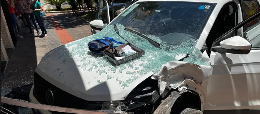 Com o impacto, a vidraça da loja quebrou e caiu sobre o carro. Dentro do comércio, prateleiras foram derrubadas e vários produtos ficaram espalhados pelo chão. O veículo, um VW T-Cross, teve danos de média monta.